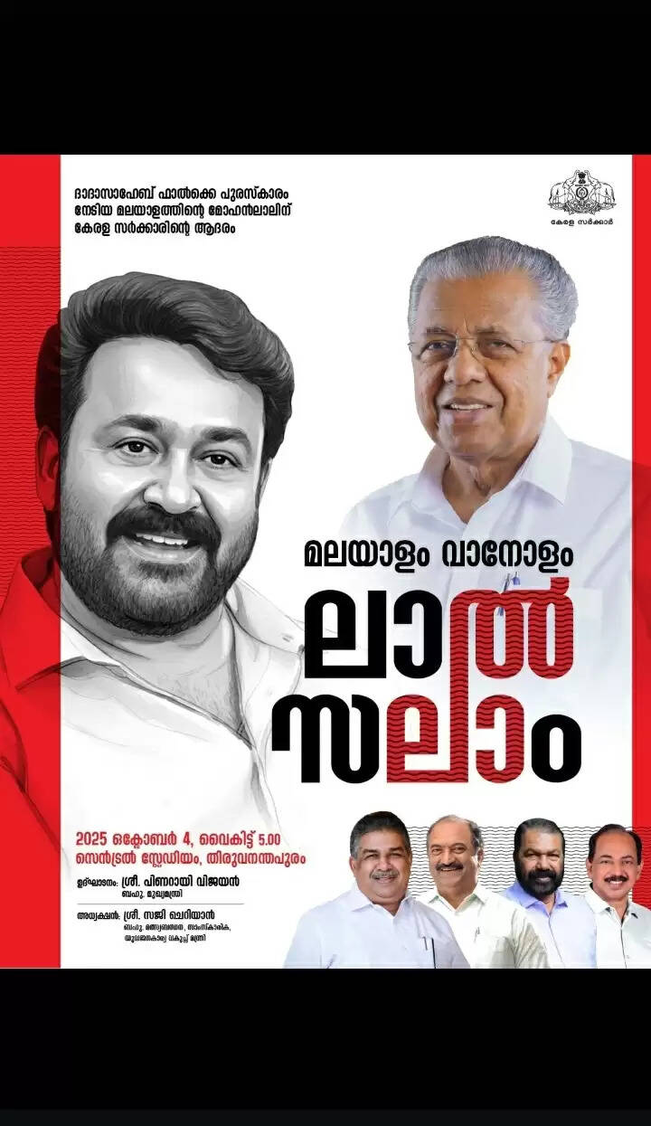 ചലച്ചിത്ര ലോകത്തിന് നൽകിയ സമഗ്ര സംഭാവനയ്ക്കുള്ള രാജ്യത്തിന്റെ പരമോന്നത ബഹുമതിയായ ദാദാസാഹേബ് ഫാൽക്കെ പുരസ്കാരം നേടിയ മലയാളത്തിൻ്റെ മഹാനടൻ മോഹൻലാലിനെ സംസ്ഥാന സർക്കാർ ആദരിക്കുന്ന ചടങ്ങിൽ പൊതുജനങ്ങൾക്ക് പ്രവേശനം സൗജന്യമാണെന്ന് സാംസ്കാരിക വകുപ്പ് മന്ത്രി സജി ചെറിയാൻ പറഞ്ഞു. ‘മലയാളം വാനോളം, ലാൽസലാം’ എന്ന് പേരിട്ടിരിക്കുന്ന മഹനീയമായ ചടങ്ങ് ഒക്റ്റോബർ നാല് ശനിയാഴ്ച്ച വൈകുന്നേരം അഞ്ചിന് സെന്ട്രല് സ്റ്റേഡിയത്തില് വച്ച് നടക്കും. കേരള മുഖ്യമന്ത്രി പിണറായി വിജയൻ സർക്കാരിന് വേണ്ടി മോഹൻലാലിനെ ആദരിക്കും. ഇന്ത്യൻ ചലച്ചിത്രരംഗത്തെ പ്രമുഖർ ചടങ്ങിൽ അതിഥികളായി എത്തും.